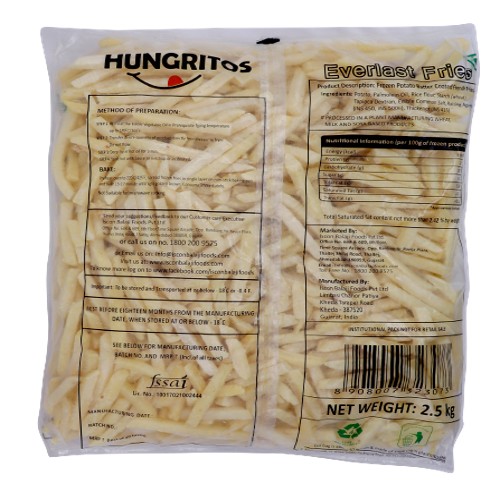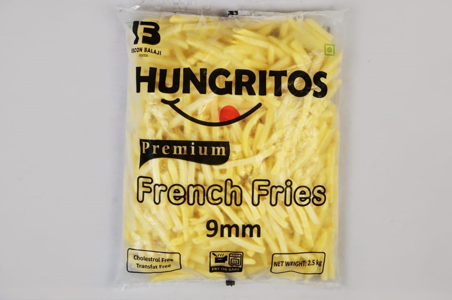 Iscon Balaji French Fries are a type of premium frozen potato product available in both 6 mm and 9 mm cut sizes, typically sold in a 2.5 kg packet. They are marketed under the brand name Hungritos by Iscon Balaji Foods